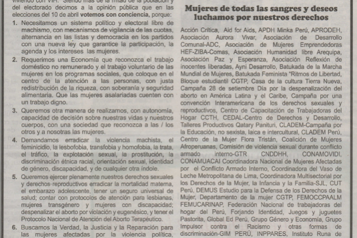 Mar192011Insurgencia Sexual Categoría: Insurgencia Sexual19 marzo, 2011Deja un comentario Compartir este articulo Share on FacebookShare on Facebook Share on XShare on X TweetShare on Pinterest Share on LinkedInShare on LinkedIn Share on WhatsAppShare on WhatsApp Navegación entre publicacionesAnteriorPublicación anterior:Entrada anteriorSiguientePublicación siguiente:LIFAS EN LA MARCHA DEL 8 DE MARZOArtículos relacionadosTribunal Constitucional escuchará demanda de madres lesbianas en defensa de su hijo y la no discriminación14 noviembre, 2024Audiencias decisivas para los derechos de personas y familias LGBTIQ+ en Perú22 agosto, 2022GRACIAS COMPAÑERXS28 agosto, 2015LIFS: 10 Años de Insurgencia y Lucha Lésbica Feminista25 agosto, 2015La diversidad (pop rock)19 junio, 2015Porque son nuestros derechos19 junio, 2015